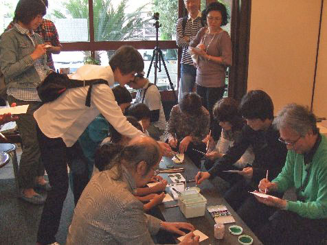 黄色・緑・赤の水彩絵の具を使って、まるで本物のような葉っぱを描きました。