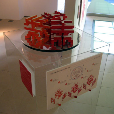 [赤]系の代表的な伝統色の和名『丹・朱・赤・紅・茜・緋』の文字を3つの立方体の側面に配置。1辺15ミリの小立方体×各9列のドット文字を該当する色面で、